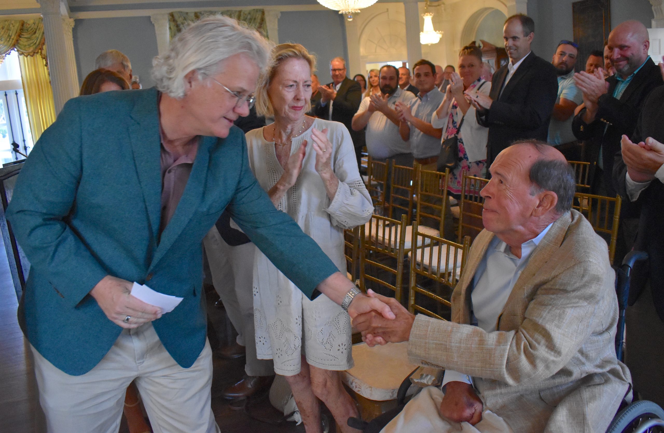 Matthew Brittain (left) shakes hands with fellow Myrtle Beach Golf Hall of Fame inductee Jim Woodring during a ceremony on Sept. 5.