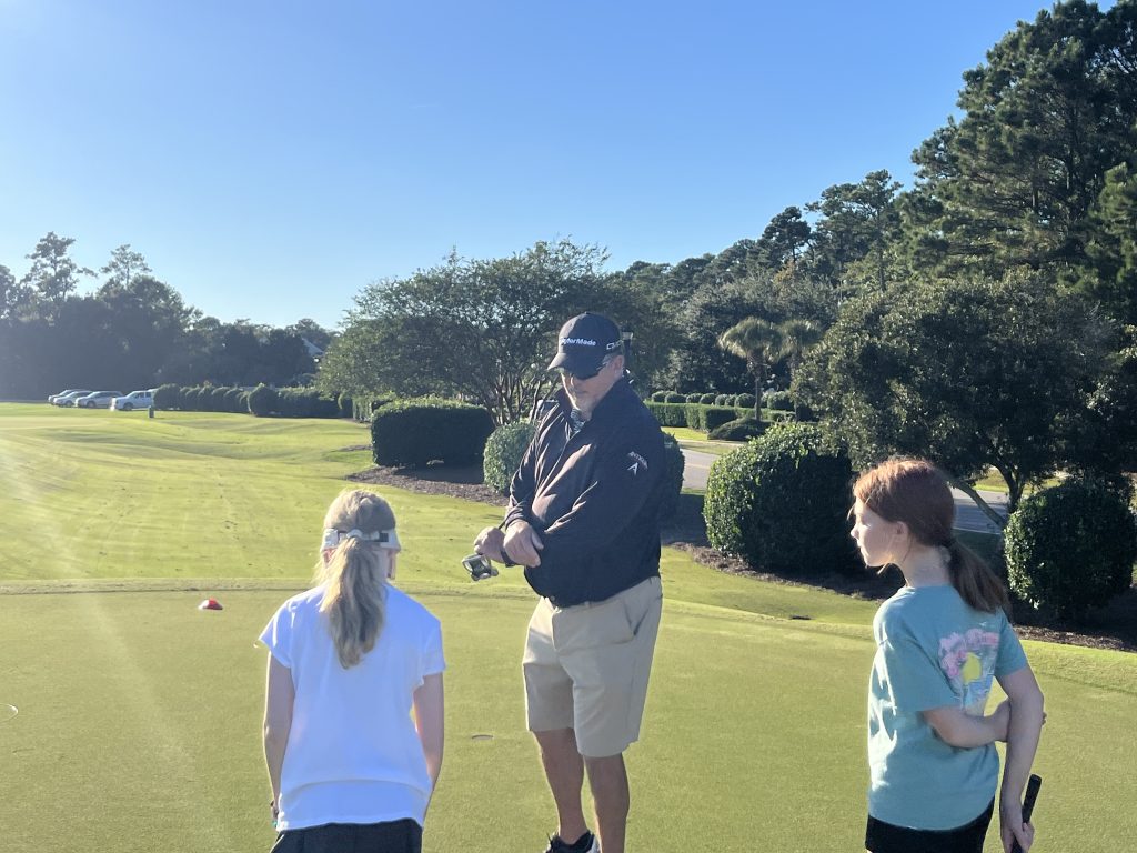 Sean ‘The Beast’ Fister works with a couple young students on the Dustin Johnson Golf School’s putting green at TPC Myrtle Beach (Alan Blondin photo)